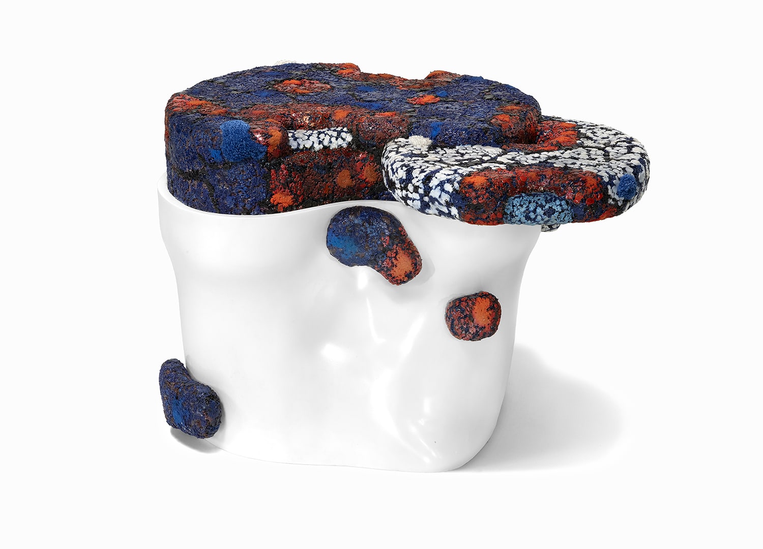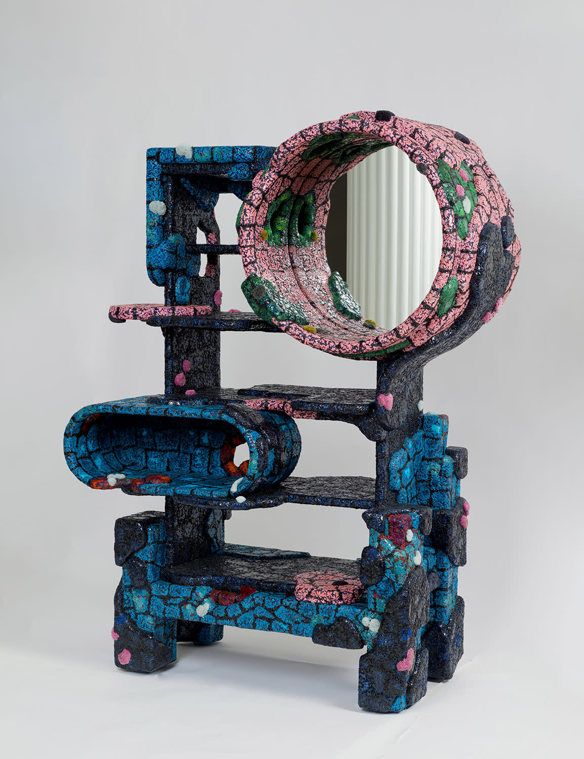 For David Klein Gallery’s presentation at Design Miami, Jack Craig has produced a group of furniture and objects from his “molded carpet” series. Transforming his chosen materials into new forms and finishes, Craig continues to create fanciful, other-worldly chairs, tables, and fixtures. Two of the outstanding pieces presented are a wildly colorful molded carpet chandelier and an equally vibrant large scale molded carpet étagère with mirror.